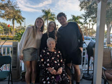Jayden, Samantha, and Drew posing with Great-Grandma.