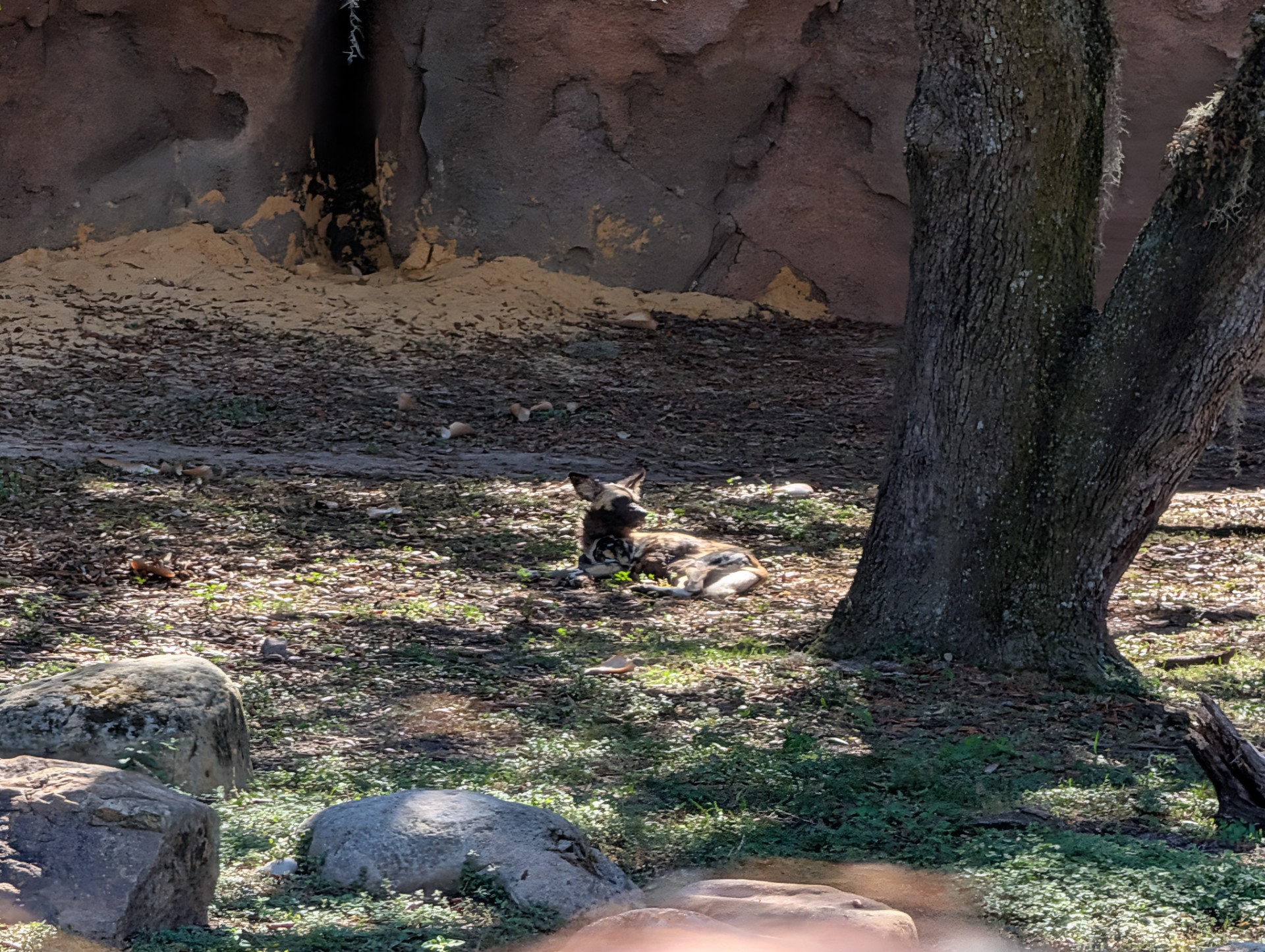 A painted dog soaking up the sun.