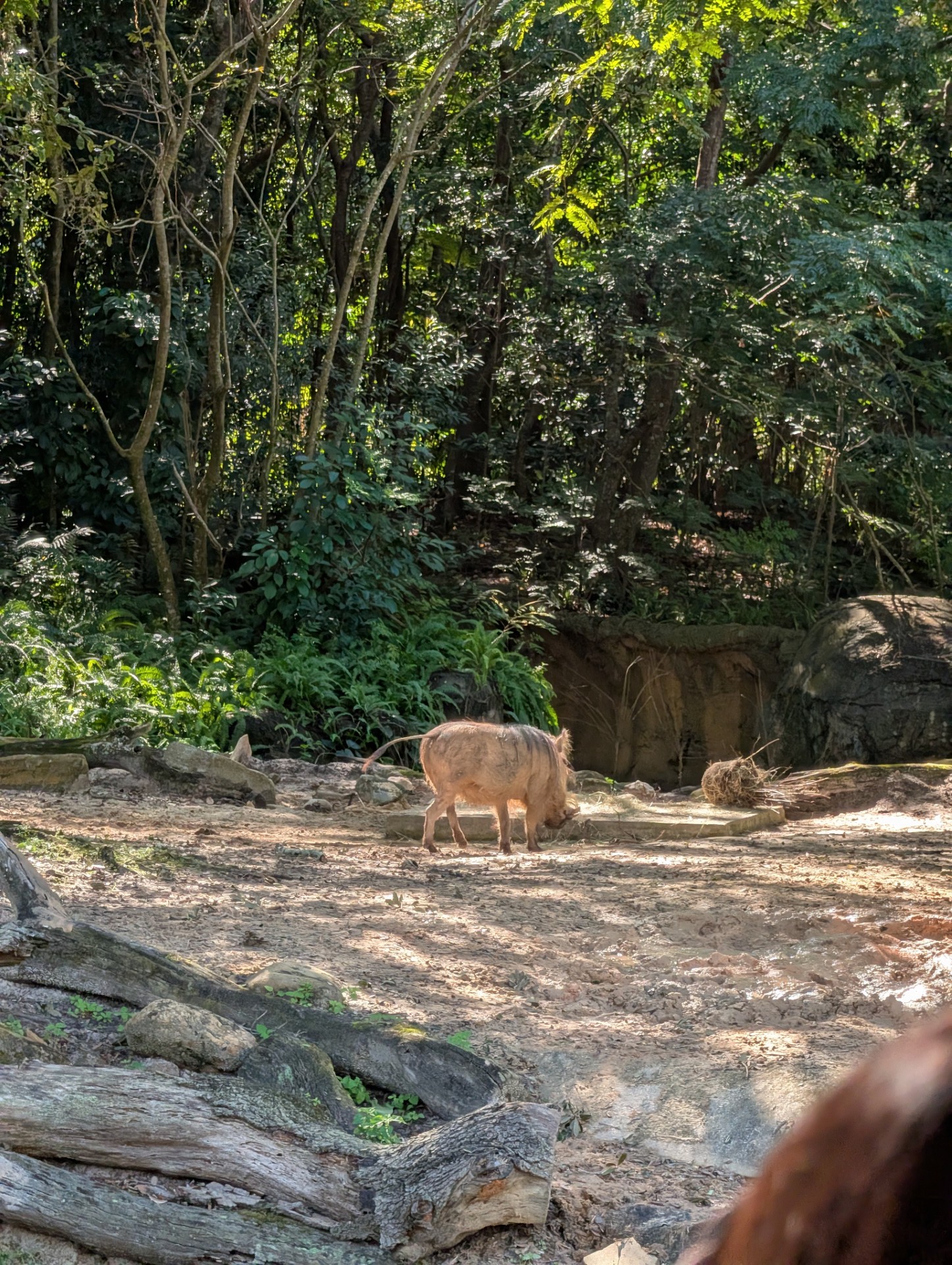 A warthog wandering about in its pen.