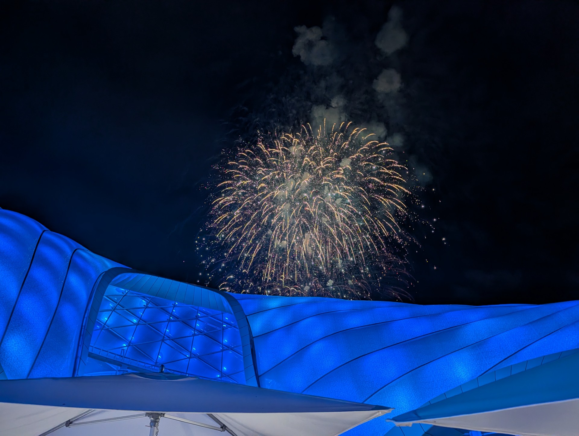 The fireworks over the TRON Lightcycle / Run canopy.